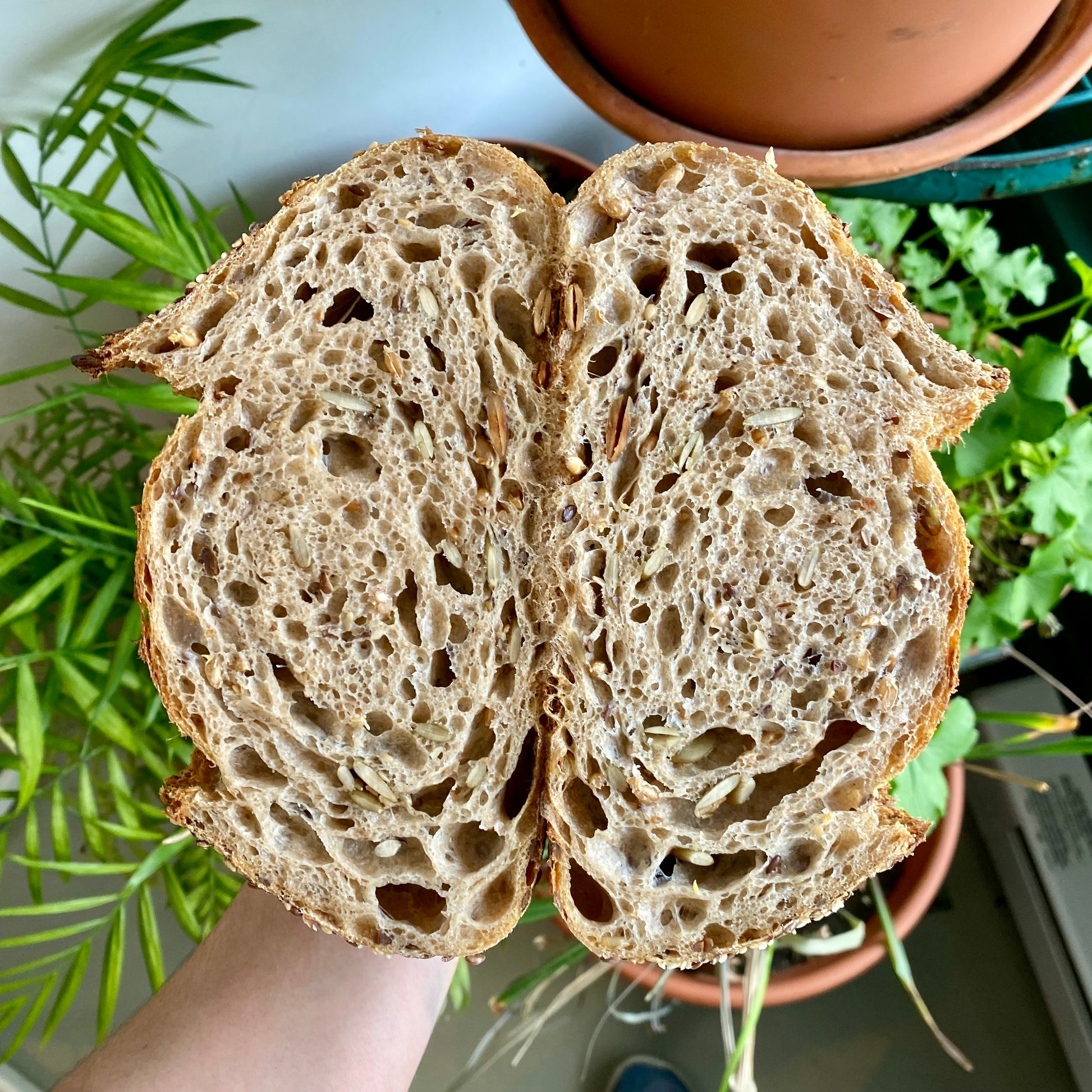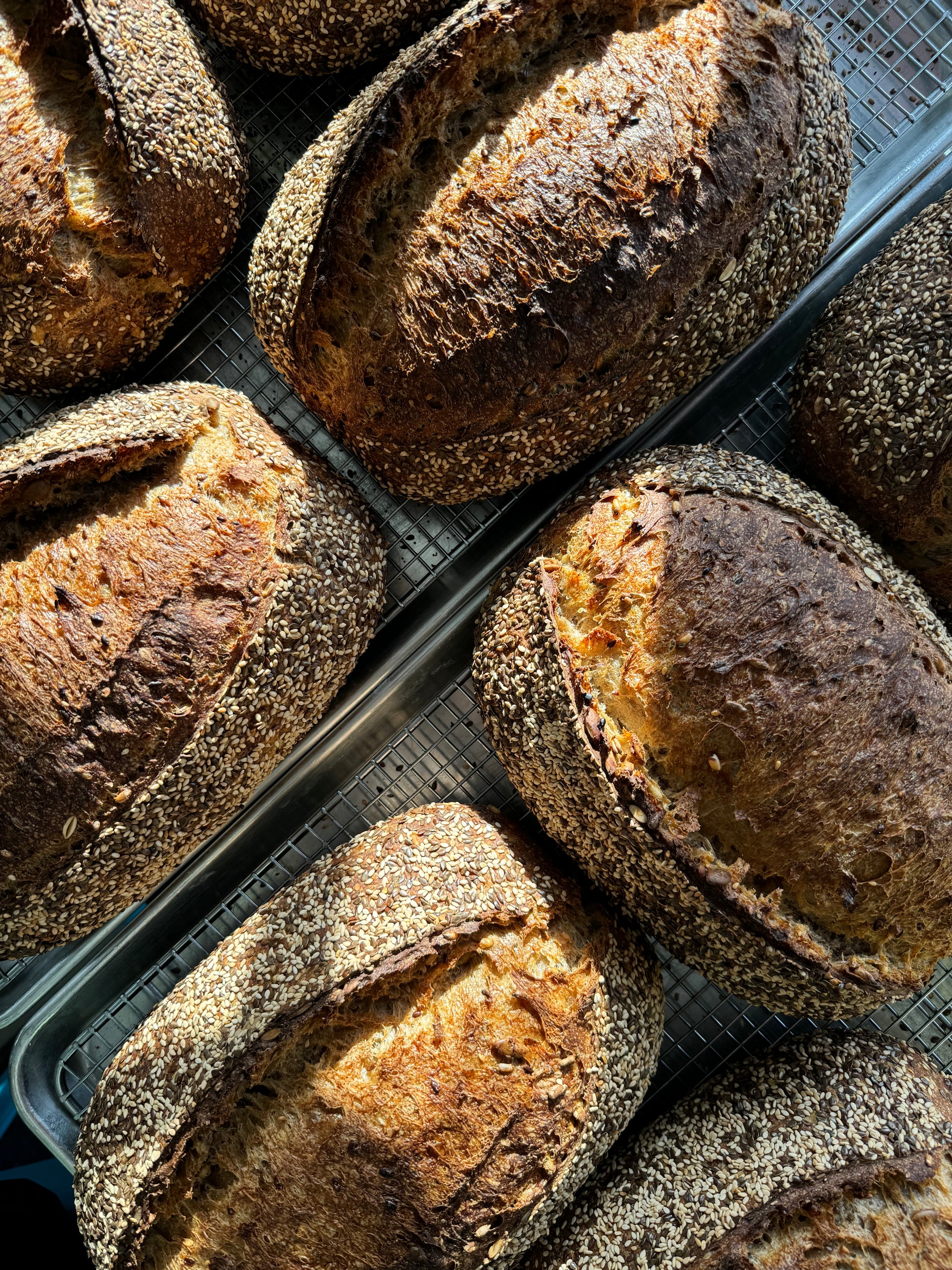 Our "Everyday Sourdough" bread filled with house-sprouted rye berries and toasted flaxseeds, sesame seeds, pumpkin seeds & sunflower seeds. Coated in sesame and flax.
